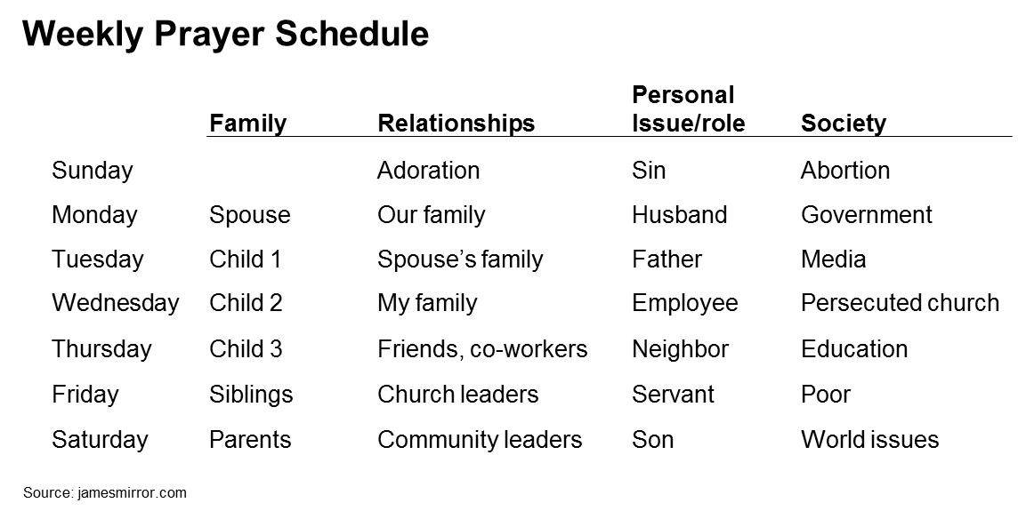 This schedule is heavily focused on requests, but the prayer should start by praising God for who He is, thanking Him for what He’s done and confessing sin. In the schedule, Sunday is focused on adoration of God and confession of sin be humble before God in preparation for the week ahead, but don’t limit those parts of prayer to only one day per week.